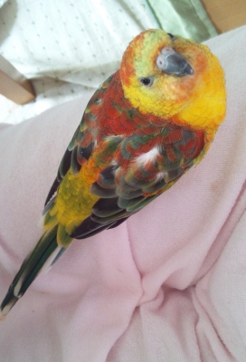 一羽で放鳥のほうが甘えやすいようです。今日は手元で水をやっていたら