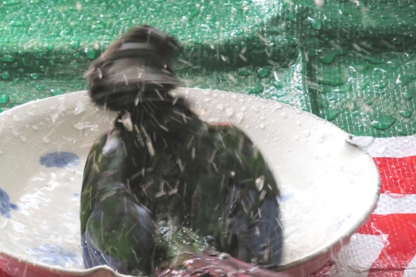 クーちゃん、ルナちゃんも、網戸越しの日光浴後に豪快に水浴びしていました