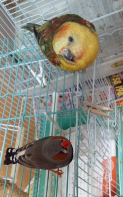 猛禽だけではなく、時々オウムやインコ達もいます。