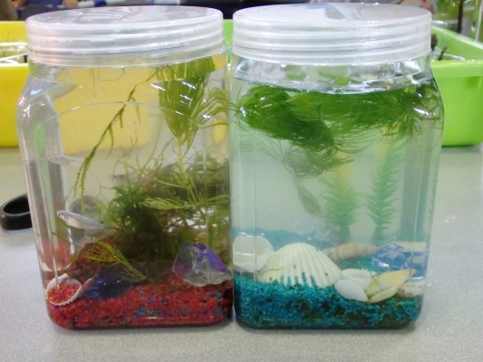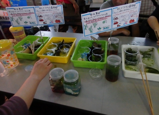 私達が参加したのは、アクアリウム作り。小瓶にメダカやヌマエビなど