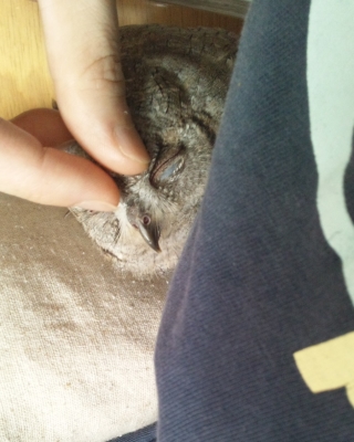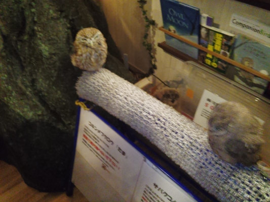 私はいつも居た場所にシンゾウが居ないのが寂しくて、今日は気になっていた小鳥のお店に電車を乗り継いで行ってきました。フィンチはシルバー文鳥が一羽いるだけでしたが、シンゾウ似の仔は期待していなかったので、セキセイインコやウロコちゃんなんかを見て楽しんでいたのですが、さて帰ろうかなって思ったら、フクロウが枝に止まってます。籠に入っていません。「えっ!?」って感じです。しばらく眺めていたのですが、傍によってプレートを見ると「南米ヒナフクロウ ナデナデ大好きです!!やさしくさわってネ♡(ハート)」と書いてあるではありませんか!触っていいの?本当に?っとおそるおそる手を伸ばしました。この小さな嘴なら噛みつかれても大丈夫なんて考えてましたが、とっても大人しいのです。目が大きくてクリクリ。羽はフサフサ。撫でると頭を下げて目を閉じてくれます。フクロウってこんなに可愛いのだって認識しました。これはchiyodoriさんも欲しくなるよ〜私もこの仔なら連れて帰りたい!!って思いました。でもchiyodoriさんの様に知識はないし、あかりは居るし無理だぁっと後ろ髪引かれる思いで店を後にしました。