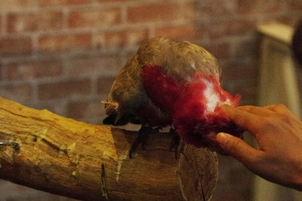 ヨウムとモモイロインコのなでてぇ攻撃に鳥キチ3人はメロメロ…