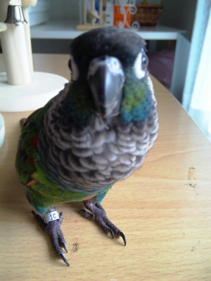 クロインコ、のクロカチャンって子はコスプレインコなんですよー、お目目が大きくて、とっても可愛い