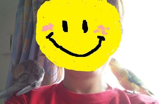 両手に花ならぬ両肩にインコ良い写真ですね〜頬にチュの華ちゃんの表情が良い!(^^)!