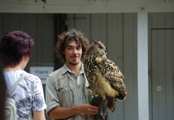 ダルマワシは観客の男の子の腕の上に乗せられ、こういう経験をすると