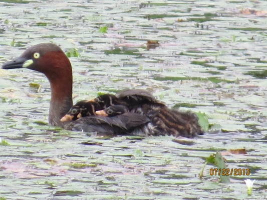 カイツブリの雛が一羽だけ遅れて一生懸命泳いでいると、お母さんが気づいて迎えに来ました、子供は相当疲れたのが脚を投げ出してお母さんにおんぶされていました、その様子がなんとも可愛く、またお母さんが子供をおんぶして帰ると、そこには、お父さんらしきカイツブリが、残りの雛を背中に乗せて待っていました