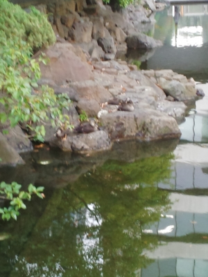 皇居のお堀に渡っていない残りのカルガモちゃんがの〜んびり親子で