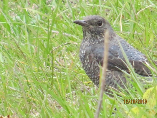 川にいる鴨たちを見てふと道沿いの土手を見るとツグミ大の鳥がなんだろうと双眼鏡で見るとイソヒヨドリ