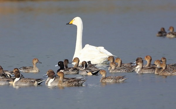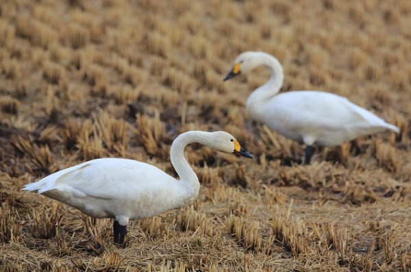 以前、紹介しました帰らなかった白鳥の元に、本日仲間が2羽、飛来してるのを確認できました・・・が、帰らなかった白鳥は、カモと泳ぎ、飛来2羽は田んぼで餌食べに夢中。1年経過して、気持ちはカモになってしまったのかな。