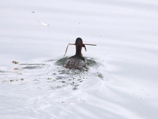 浮き巣の構造は、驚いたことにただ、浮いているわけではく、水上は5〜6cm、水面下は約35cm位あり、マカモ、ヨシ、蓮などの茎、葉などで作られ、下に行くほど細まっている。水底の根などに固定してあるそうです。