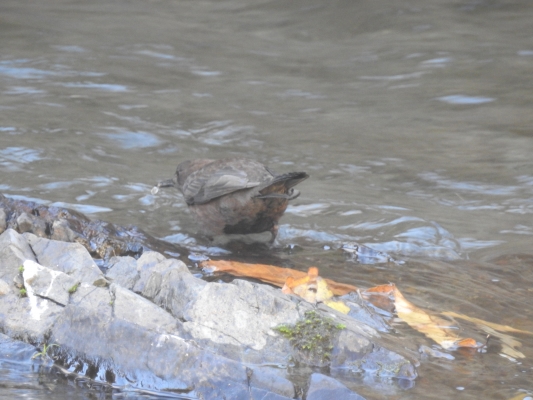 カワガラスと言って、体もカラスよりかなり小さく、体長は21センチから23センチ位、ずんぐりした体つきで、焦げ茶色のような色をしています