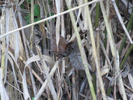 そして、じっと見ていたら萱の根元に何とミソサザイがいました