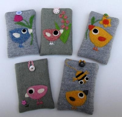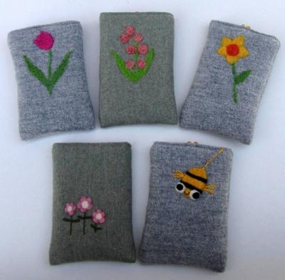 スマートフォン対応サイズの小鳥のポーチが入荷しました! 羊毛で小鳥ちゃんが刺しゅうされています。 今回はミツバチやチューリップも登場!