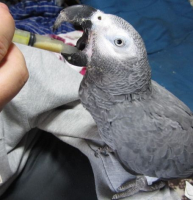 現在、挿し餌でペレット、小松菜、処方されたビタミンを混ぜたものをペースト状にしてあげています。