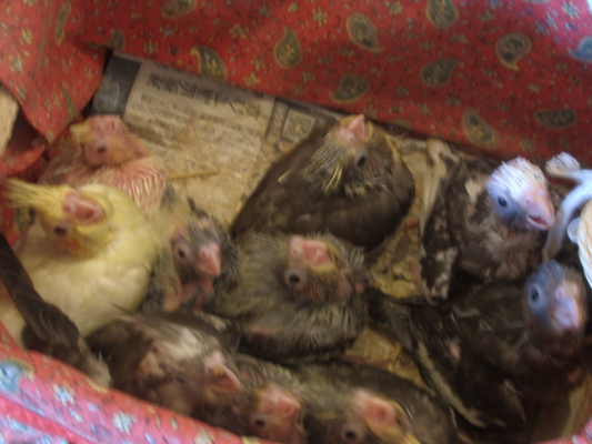 上に掛けていた布を取ると、中には生後約3〜4週間のオカメの雛ちゃんがぎっしり!!