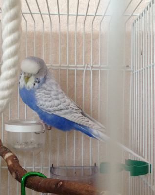 実は、我が家のジャンボセキセイ、すみれ(女の子)も、terys birdsさん出身なんですよ。色もスパングルブルーです。てんちゃんや写真のジャンボさんより濃い、渋めの青で、背中に薄墨色の縁取り(スパングル)があります。てんちゃん、病気で白っぽくなって、健康になるとともに水色とグレーが復活してきたって、そういう事もあるんですね〜。ますます元気になりますように。