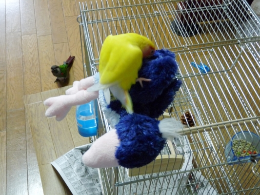 あおもちゃ、ブランコとって、餌さいれ、水入れも高い位置に、止まり木も一本に、自然木は少し短いので端ですりすりするので、ケージの付属品で・・底にアルミホイルをしいたり、サランラップをしいたり、さすがに水は手入れが大変だし、留守の時万が一のことがあったらいけないから出来てませんけど・・