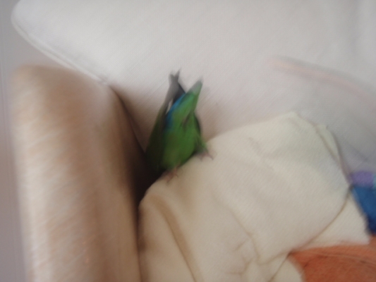 「ピピちゃんモカです!羽が気になって、切った所をカジカジしてたら、ボロぼうきの様な羽先になっちゃいました。グスン。」