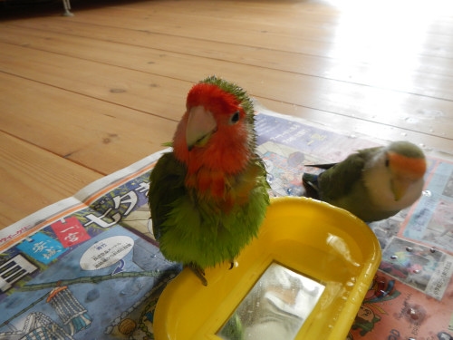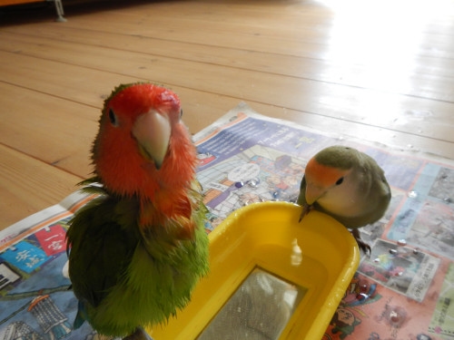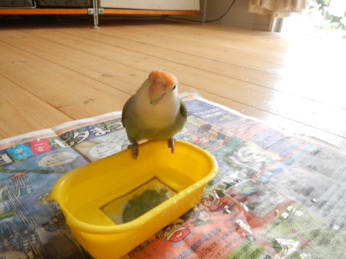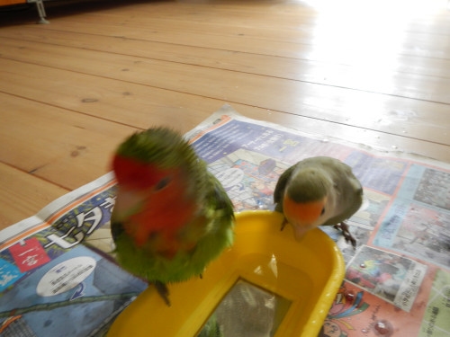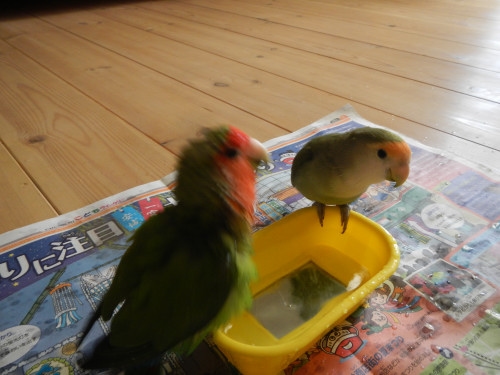 水浴び、ピーちゃんが先なんだね、亭主関白?(って何かわかる?)