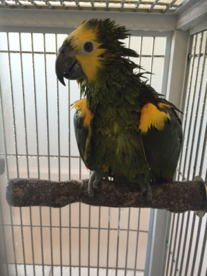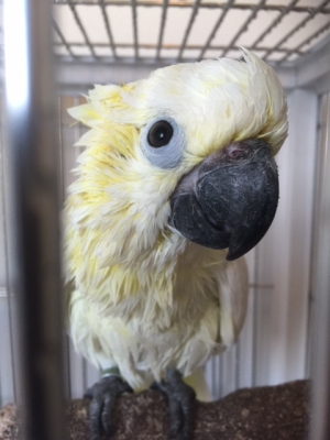 白色オウムやヨウムは防水機能が良く効いてますがこの子はもう本当に地肌までビシャ濡れですから