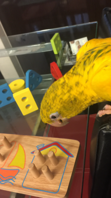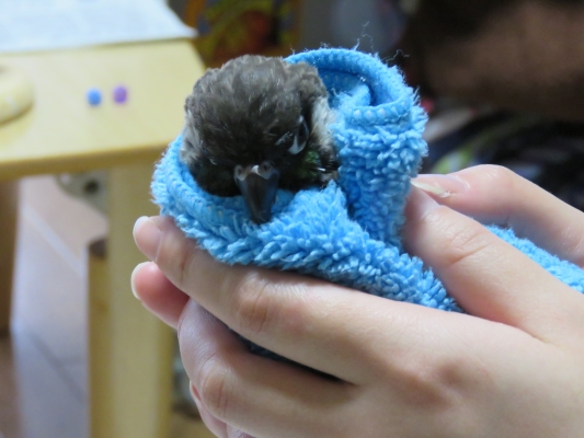 勿論、指から肩ににあがって逃げようとしますし、羽ばたき運動をして、僕いい子❗をアピールします。