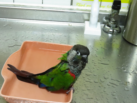 冷たいけど水浴びしたいニョウインコさん、我が家の2羽のコニュアも同じです、しかも寒さに震える所も一緒だし、羽に防水機能は無いのかと疑うくらいビショビショになります