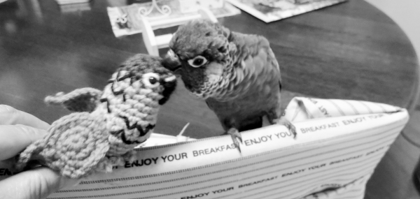 『おはよ』『ノアちゃんこんにちは』『おやっちゅみ』『バイバイ』『おいで』『ちーちゃん』『ええ子やね』『はいっ』は我家のインコ達の共通語。それに、それぞれの鳴真似も!何より困るのはコミドリコンゴウインコの鳴き真似。これだけは止めてほしい…。