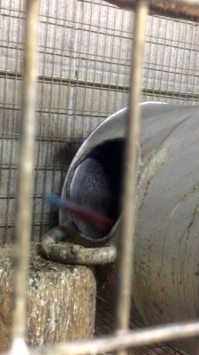 今夜は犬の散歩に出ようと、バリケンのトビラを開けに行くと、丁度巣箱の中からベニコンゴウインコのメスが出て来て、ケージをよじ登る彼女の姿!何と卵が出るのか?と思うぐらい、大きく腫れている様な、ハイ!ため糞なんですね、水を飲んで寛いでいる側へオスが来てエサを与えていました、