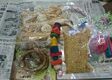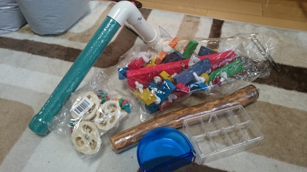 中身は、お風呂場で使えるコンクリートパーチ、ヘチマのついたおもちゃ、木がいっぱいのおもちゃ、太めの止まり木、半月皿1組、散らかし防止エサ皿、でした