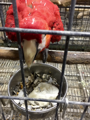 昨日の朝は少し急いでいたので、ジャングルは簡単に世話をして仕事に出ました、途中でジャングルの様子を見に寄ってみましたら、まぁ〜何と、クルマサカオウムのマルちゃんがケージから脱走!楽しそうに遊んでいるんですね(笑)でもね、他の鳥さんのケージの上に飛び乗ると気の強いキエリボウシやベニコンゴウのケージだと・・・怪我しますからね、ハイ、ケージに戻って頂きました(*^_^*)