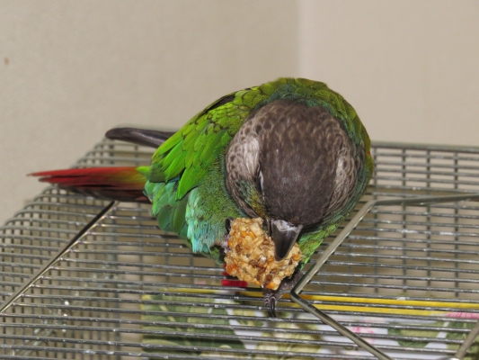 昨年は到着早々体調を崩したため、温度28℃、湿度65%という隔離環境で初めて冬を越したワイルドアケボノインコのリキも、今年はまだ暖房無しですが前の様に鼻水を垂らすことも下痢気味になることもなく、元気一杯食欲旺盛です(^^)