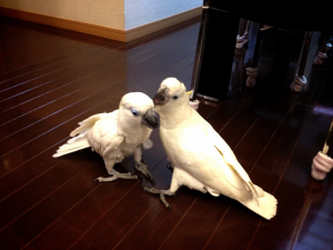 『おはよ』『ノアちゃんこんにちは』『おやっちゅみ』『バイバイ』『おいで』『ちーちゃん』『ええ子やね』『はいっ』は我家のインコ達の共通語。それに、それぞれの鳴真似も!何より困るのはコミドリコンゴウインコの鳴き真似。これだけは止めてほしい…。
