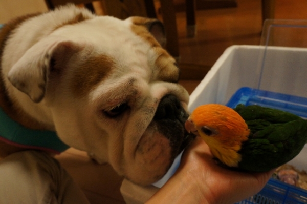 『おはよ』『ノアちゃんこんにちは』『おやっちゅみ』『バイバイ』『おいで』『ちーちゃん』『ええ子やね』『はいっ』は我家のインコ達の共通語。それに、それぞれの鳴真似も!何より困るのはコミドリコンゴウインコの鳴き真似。これだけは止めてほしい…。
