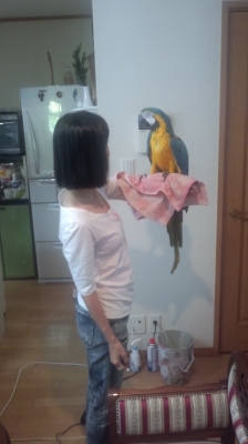 『おはよ』『ノアちゃんこんにちは』『おやっちゅみ』『バイバイ』『おいで』『ちーちゃん』『ええ子やね』『はいっ』は我家のインコ達の共通語。それに、それぞれの鳴真似も!何より困るのはコミドリコンゴウインコの鳴き真似。これだけは止めてほしい…。