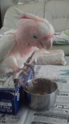 『おはよ』『ノアちゃんこんにちは』『おやっちゅみ』『バイバイ』『おいで』『ちーちゃん』『ええ子やね』『はいっ』は我家のインコ達の共通語。それに、それぞれの鳴真似も!何より困るのはコミドリコンゴウインコの鳴き真似。これだけは止めてほしい…。