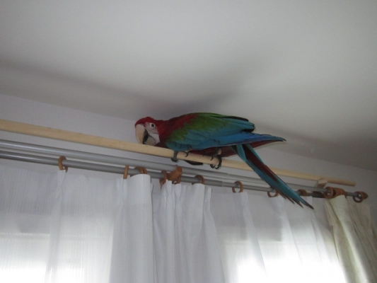 今朝はカーテンレールの上に行っちゃって。