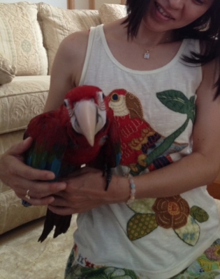 『おはよ』『ノアちゃんこんにちは』『おやっちゅみ』『バイバイ』『おいで』『ちーちゃん』『ええ子やね』『はいっ』は我家のインコ達の共通語。それに、それぞれの鳴真似も!何より困るのはコミドリコンゴウインコの鳴き真似。これだけは止めてほしい…。