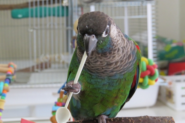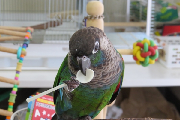 『おはよ』『ノアちゃんこんにちは』『おやっちゅみ』『バイバイ』『おいで』『ちーちゃん』『ええ子やね』『はいっ』は我家のインコ達の共通語。それに、それぞれの鳴真似も!何より困るのはコミドリコンゴウインコの鳴き真似。これだけは止めてほしい…。