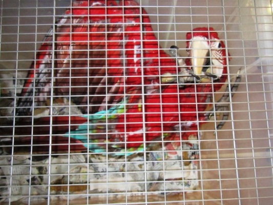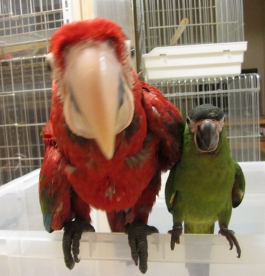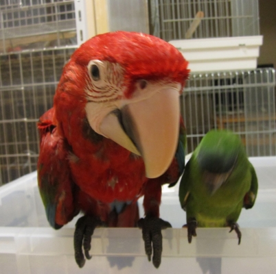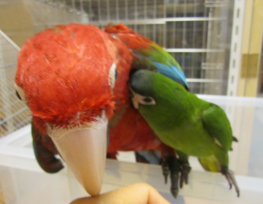 コミドリコンゴウインコから口移しで餌を貰うベニコンゴウインコって…。
