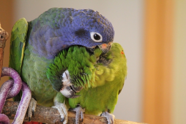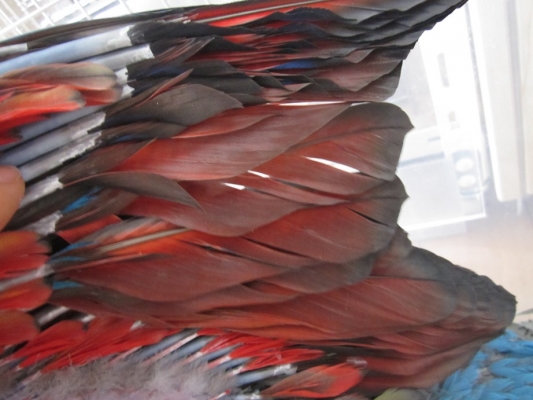 パンちゃんの親御さん。  翼の羽も揃ってきました。綺麗な青! 翼は裏から見ると赤系です
