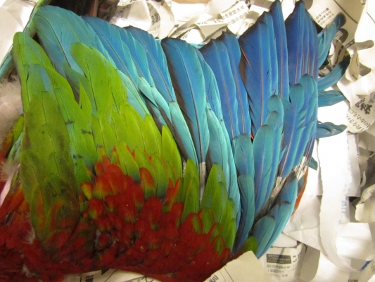 >木彫りのコンゴウインコのドアチャイムが木片に…\(☆o☆)/ さすが大型インコ。