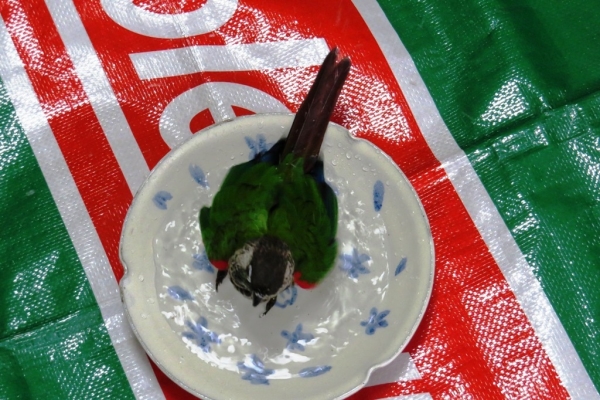 取りあえず頭をザボンと水に潜らせちゃう仔、水入れの真ん中で立ってお腹まわりだけじゃぶじゃぶしてる仔、淵に止まってモサモサしてるだけの仔、水入れは嫌いで、水道の蛇口下に来る仔等々。