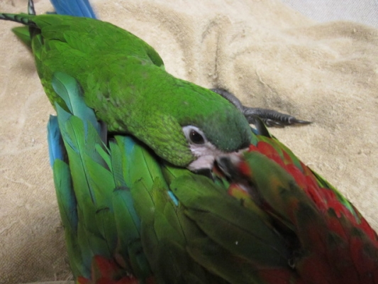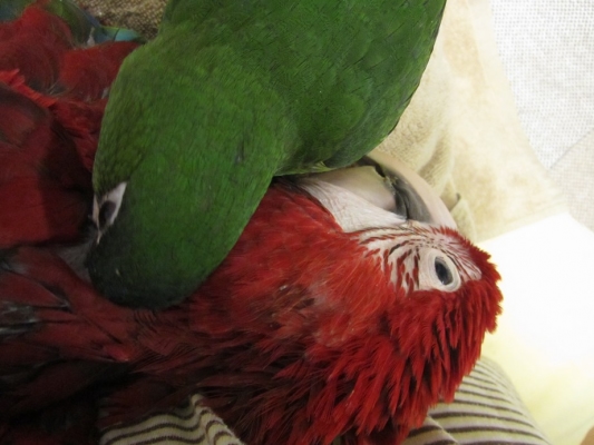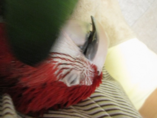 ベニコンゴウは子犬の様にベタベタ甘えたになるとは聞いていましたが、最近のパンちゃんも膝の上に置いていると私の腕を枕の様にして寝ちゃったり…。