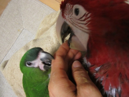 『おはよ』『ノアちゃんこんにちは』『おやっちゅみ』『バイバイ』『おいで』『ちーちゃん』『ええ子やね』『はいっ』は我家のインコ達の共通語。それに、それぞれの鳴真似も!何より困るのはコミドリコンゴウインコの鳴き真似。これだけは止めてほしい…。