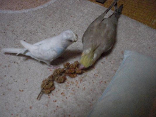 ところで『目指せ!正統派ペア!!』方針にのっとり、昨日より同居を開始したコミドリコンゴウインコペア、取りあえず何とか流血騒ぎもなく、一緒のケージに収まっております。