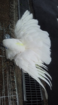 ヒロシのケージを夕方表に出すと羽を広げて飛ぶのかと思ったら、ただの水浴び?でした(^_^)