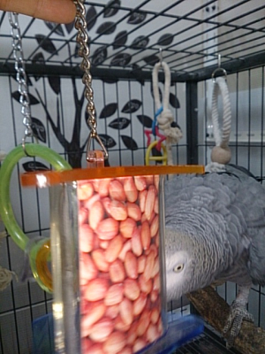 >ピーナッツがいっぱい入ったフォージングトイに2羽ともくぎづけですね