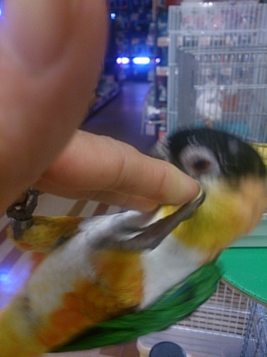 ペットショップで、タイハクオウム&ヨウムをカキカキしに行ったのですが、新たに可愛い仔が居ました! アカビタイムジオウムが♪ 初対面なので、どうかなって思ったのですが、籠越しにカキカキさせてくれました!(^^)! また、通ってしまう楽しみが増えてしまいました♪