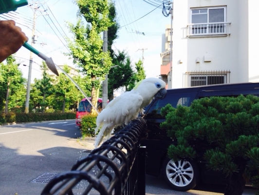 『おはよ』『ノアちゃんこんにちは』『おやっちゅみ』『バイバイ』『おいで』『ちーちゃん』『ええ子やね』『はいっ』は我家のインコ達の共通語。それに、それぞれの鳴真似も!何より困るのはコミドリコンゴウインコの鳴き真似。これだけは止めてほしい…。