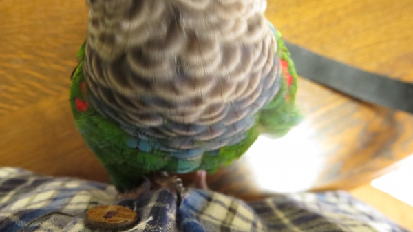 放鳥時、呼んでも来ない事が多い仔も、一羽を肩に乗せたりカキカキしてると、皆バサバサ寄ってきて我も我もと肩に登って来たり、3,4羽の頭がにょきにょき出てきたり…。